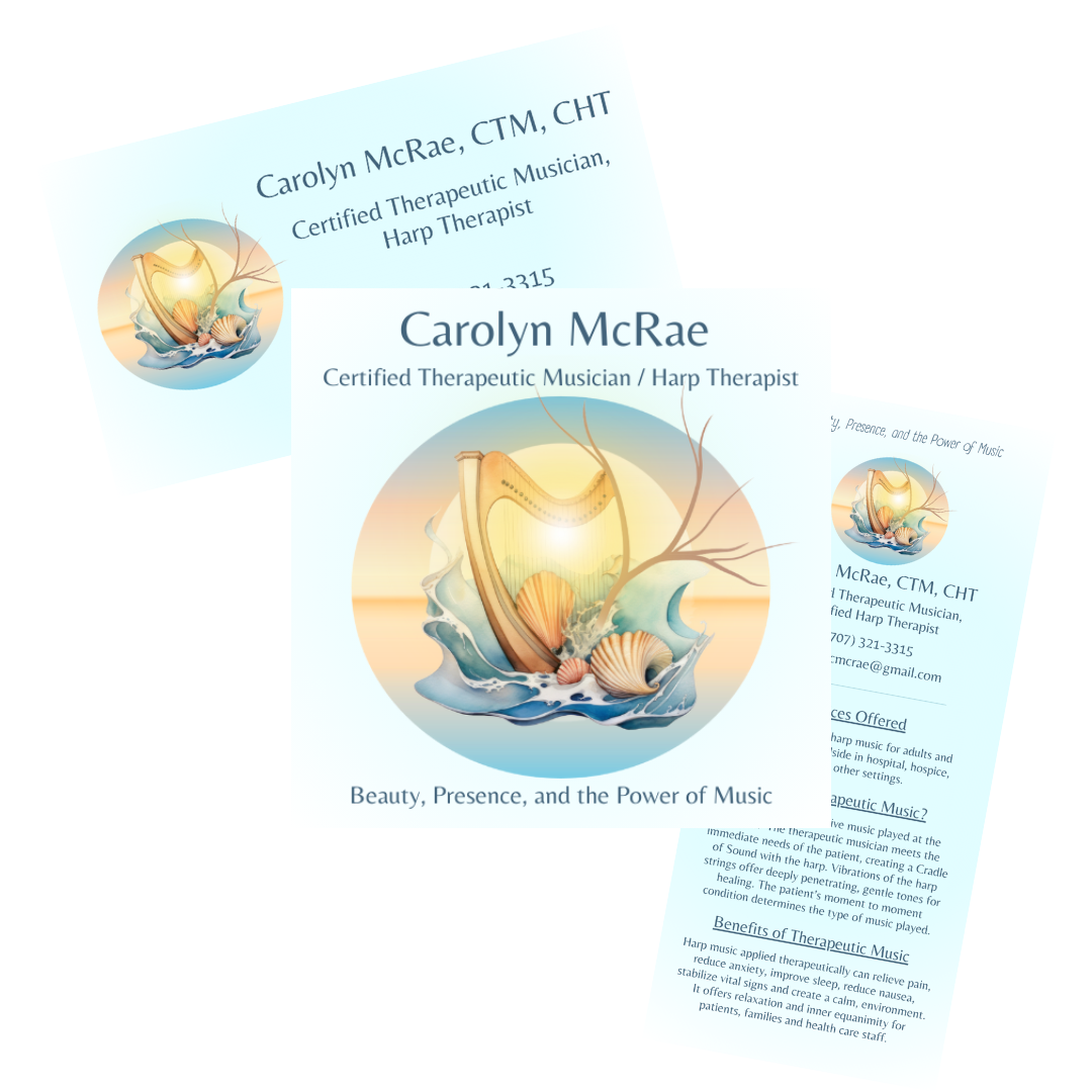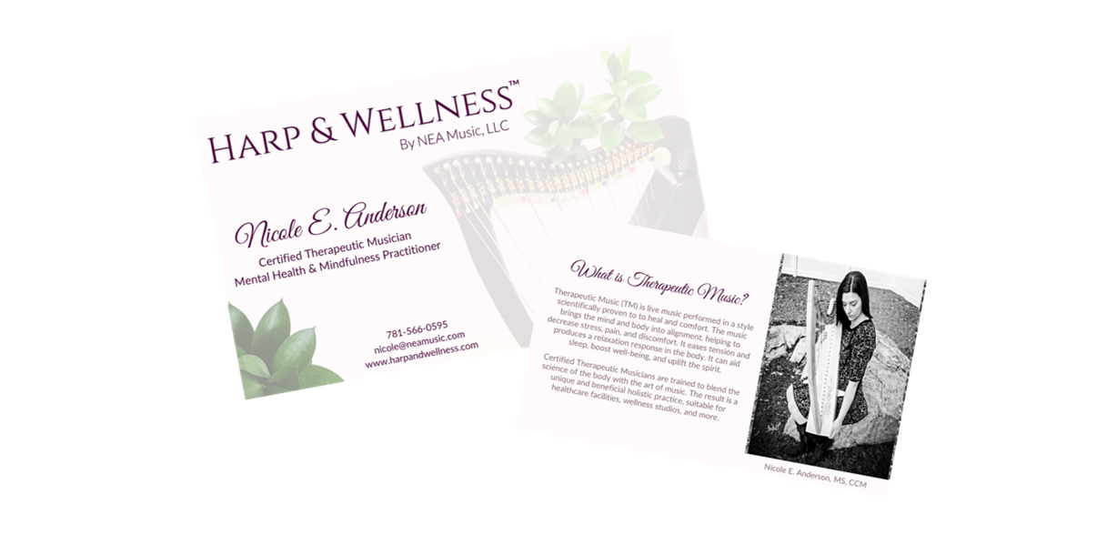 "Nicole recently designed a logo and postcard I can use to introduce myself and the concept of therapeutic music to staff, patients, and family in the medical facilities where I offer my harp music. She was so easy to work with – I simply gave her a brief description of my vision and provided the narrative I wanted incorporated and within a week she had three great designs ready for my review and comment. She also managed the printing process and so I did not have to worry with that piece either which was a great relief. I am so pleased with the logo and the final product and I look forward to using the postcards as I begin my journey as a therapeutic musician. Thanks so much, Nicole, for the beautiful design work and high quality production!" -Claudia W.