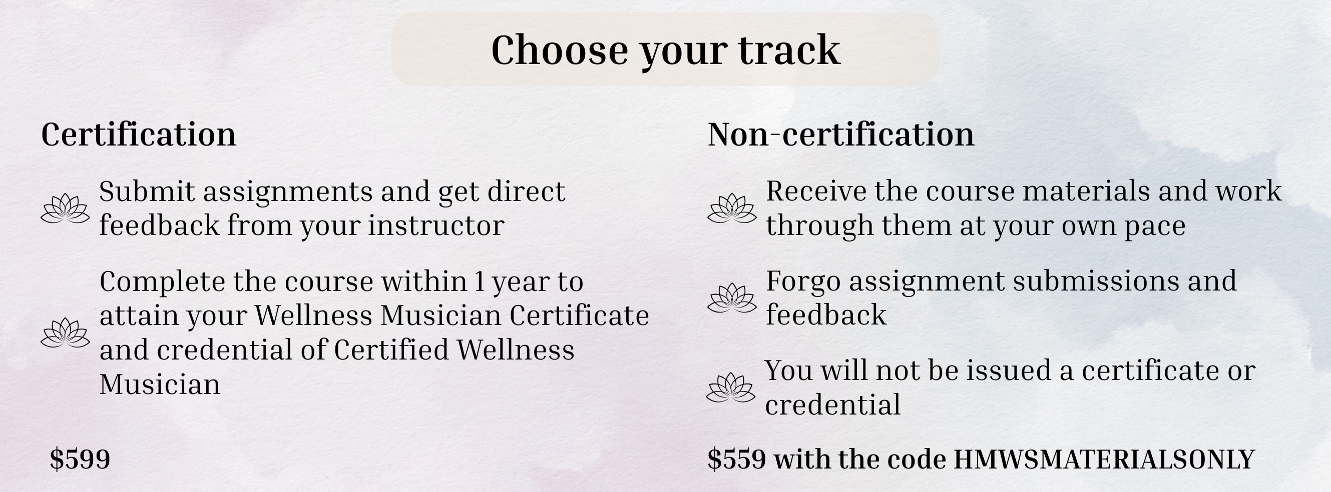 The non-certification track was developed for students who wish to only purchase the course materials. If you feel the credential is not necessary for your specific work, this is a good option. Use the code HMWSMATERIALSONLY to enroll in the non-certification track and save $40.